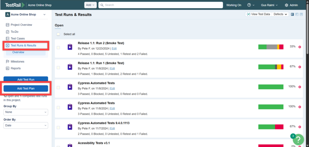 テスト ランを 1 つのテスト計画の下にグループ化することで、複雑なテスト シナリオを調整し、進捗をより効果的に監視し、テスト要素を整理しておくことができます。