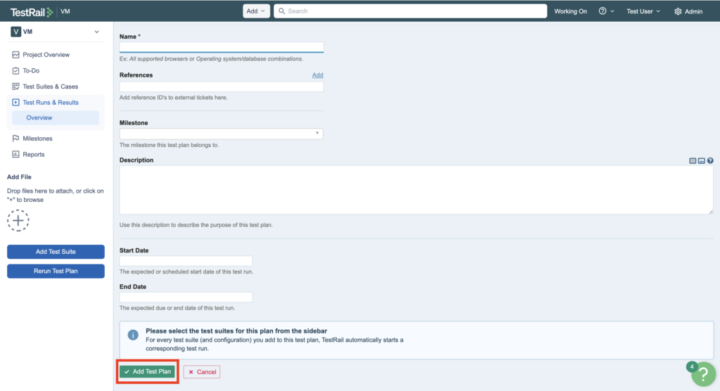 次に、テスト ランと結果の下にある [テスト計画の追加] をクリックしてテスト計画作成フォームを開き、新しい計画の設定を開始します。