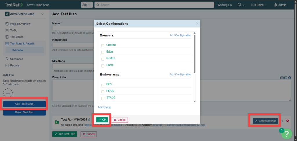 また、異なるブラウザーや環境などの構成を追加するオプションもあり、作業を複製することなく、複数のプラットフォームで同じテスト ケースを実行できます。完了したら [OK ] をクリックします。