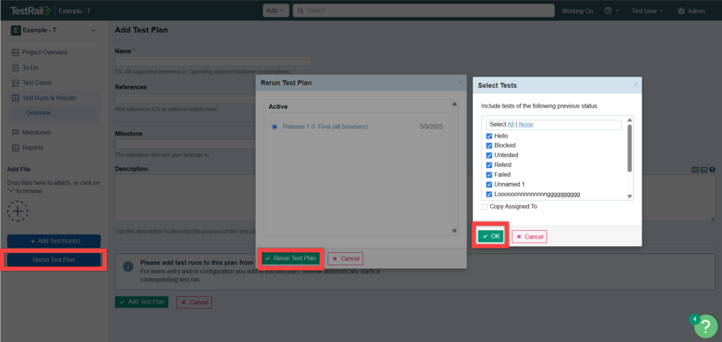 [テスト計画の再実施] をクリックすると、プロジェクト内のアクティブなテスト計画がすべて表示されます。新しいプロンプトで [テスト計画の再実施] をクリックすると、含めたいテストを選択し、それぞれに割り当てられたテスト担当者をコピーできます。完了したら [OK ] をクリックします。