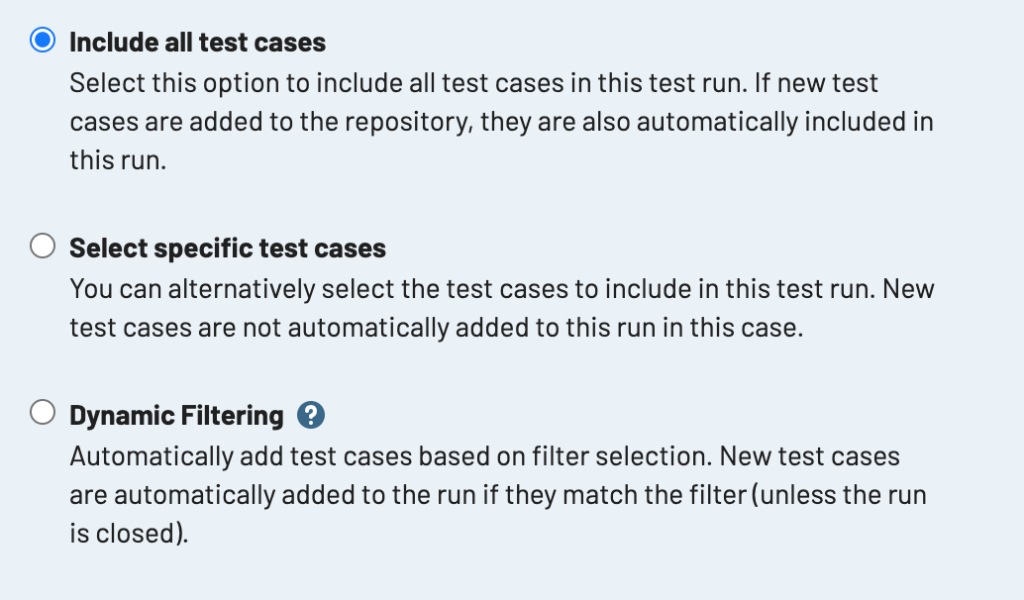 テスト ランを作成するときのデフォルトの選択肢は、すべてのテストケースを含めることです。このオプションが選択されている場合、プロジェクト (または、プロジェクトで複数のスイートが有効化されている場合はスイート) のすべてのテスト ケースがテスト ランに含められます。さらに、プロジェクトまたはスイート内で新規テスト ケースを作成した場合、テスト ケースは自動的にテスト ランに追加されます。