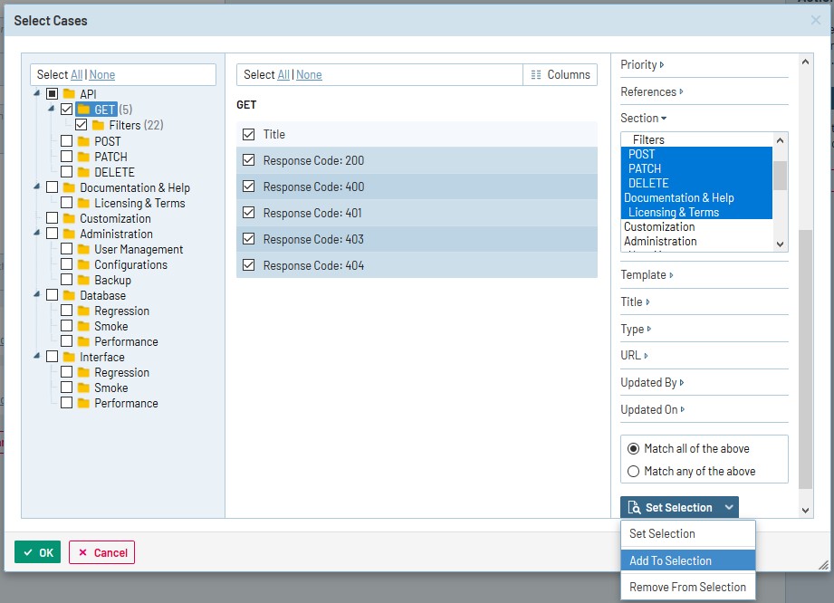 テスト ランを作成または編集するとき、テスト ランに含めるテスト ケースを選択する方法は複数あります。このセクションでは、それぞれの選択方法とその機能について説明します。