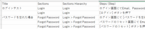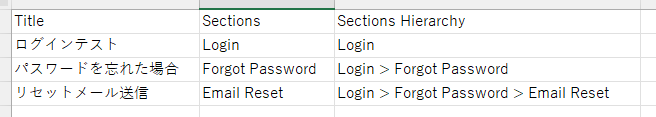 3. 1 件のテストケースを複数行で定義する場合、1 行目のみ「セクション」と「セクションの階層」を定義する必要があります。