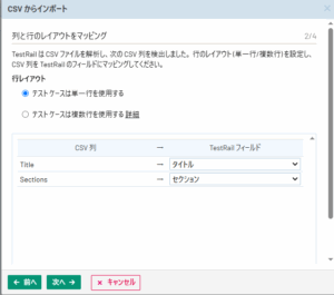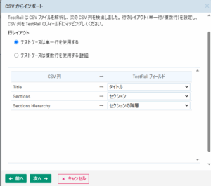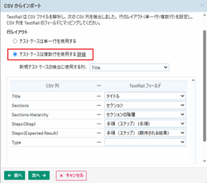 ‘テストケース(ステップ)’ テンプレートのテストケースをインポートする際、行レイアウトで ‘テスト ケースは複数行を使用する’ ラジオボタンを有効化している場合、新規テストケースの先頭行だけに「セクション」と「セクションの階層」を定義してください。