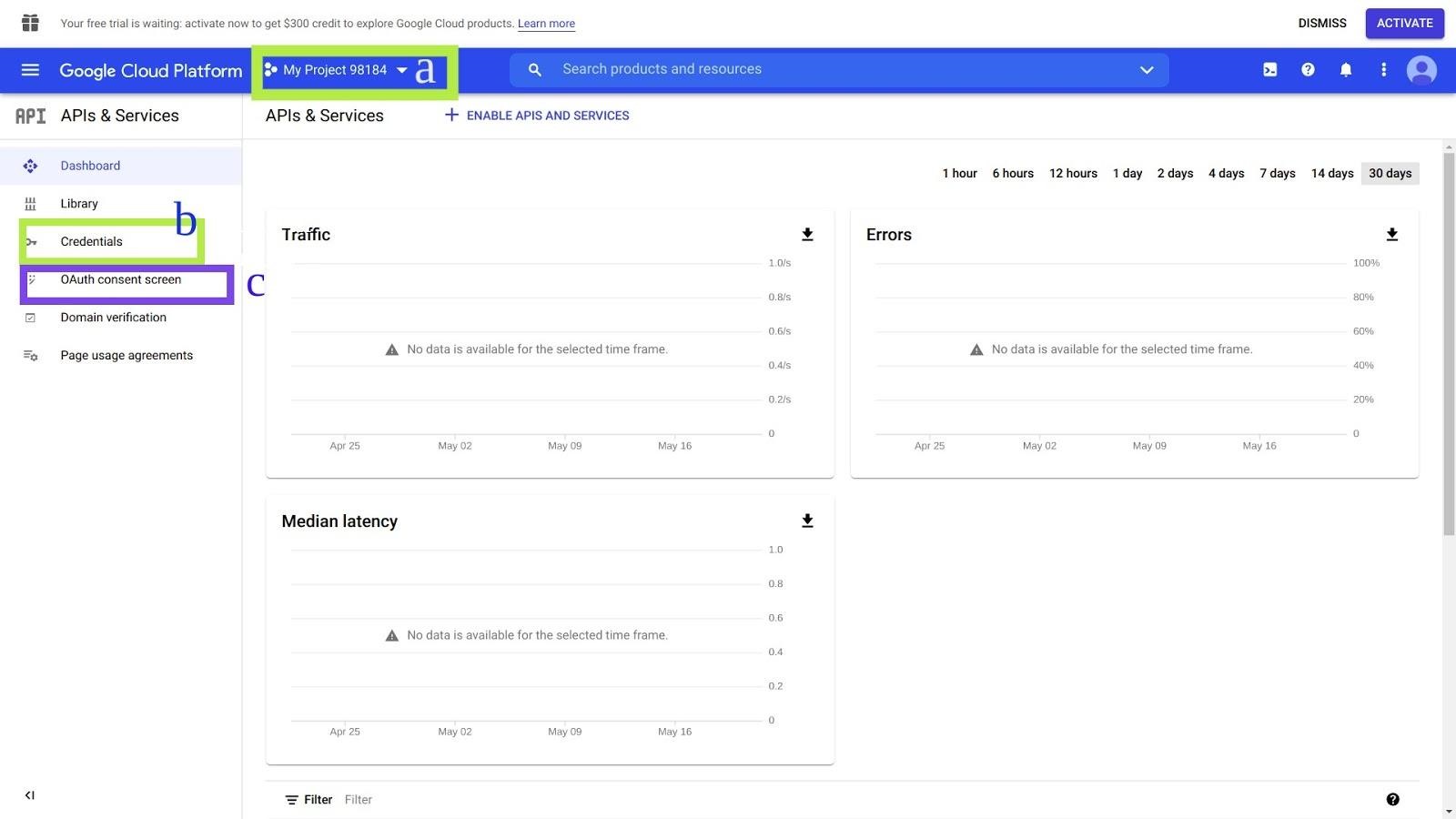 5. Credentials: 左側のナビゲーション パネルの [Credentials] をクリックします (上の図で b としてマークされています)。