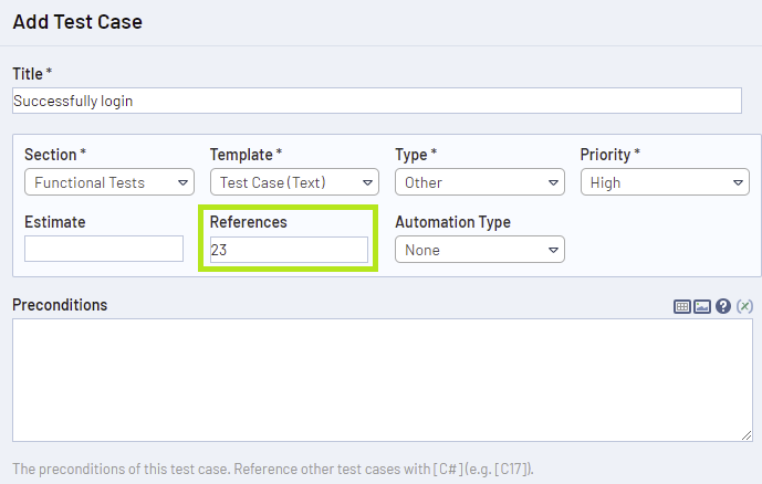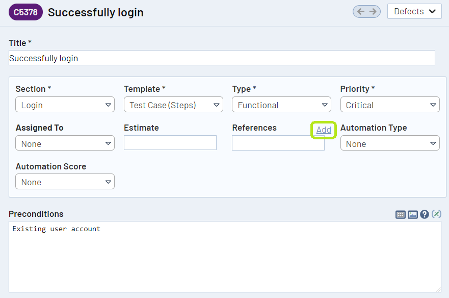 TestRail provides an Add link in the test case editor view to quickly navigate to the Azure DevOps work item creation screen. This allows you to quickly create new requirements you want to trace in your test cases. Note that after creating your new work item, you need to copy and paste its ID to the References field.