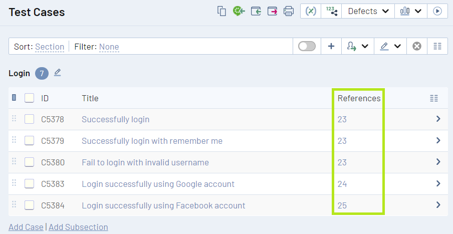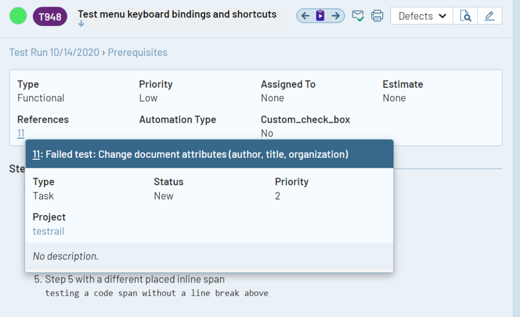 The Defects menu, also know as TestRail’s Defect From Anywhere feature, is displayed on top of most pages for quick access.