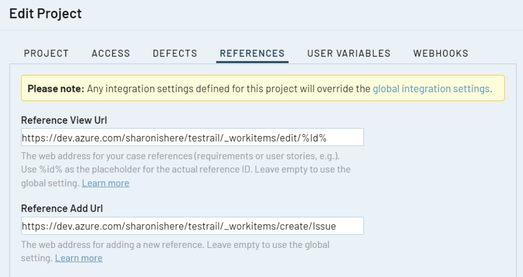 - Go to the Admin page, select Integration to configure globally or Projects for a single project, and open the References tab