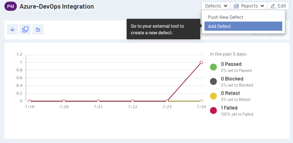 TestRail provides quick navigation to report defects using the Azure DevOps interface. You can do it from two different places – the Defects menu and the Add Test Result dialog.