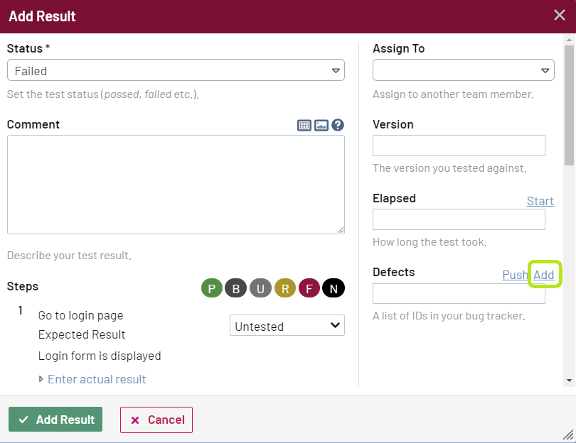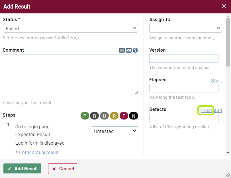 The Add Test Result dialog displays the Push link next to the Defects field to efficiently report a defect while you’re submitting your test results.