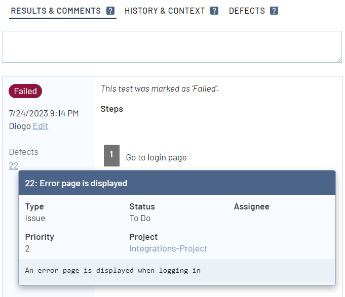 Simply hover over defect links and a dialog will show you all the latest information without having to navigate to Azure DevOps. These links are available in the test results directly, as well as the Defects section on test runs, test plans and milestones.