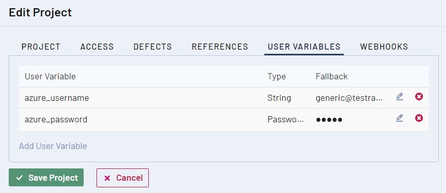 We recommend using User Variables when configuring any integration credentials. This allows you to provide generic credentials without disclosing them, and also lets users define their own credentials in their personal settings, for better access control. Below you can see an example of how to set variables in your configuration.