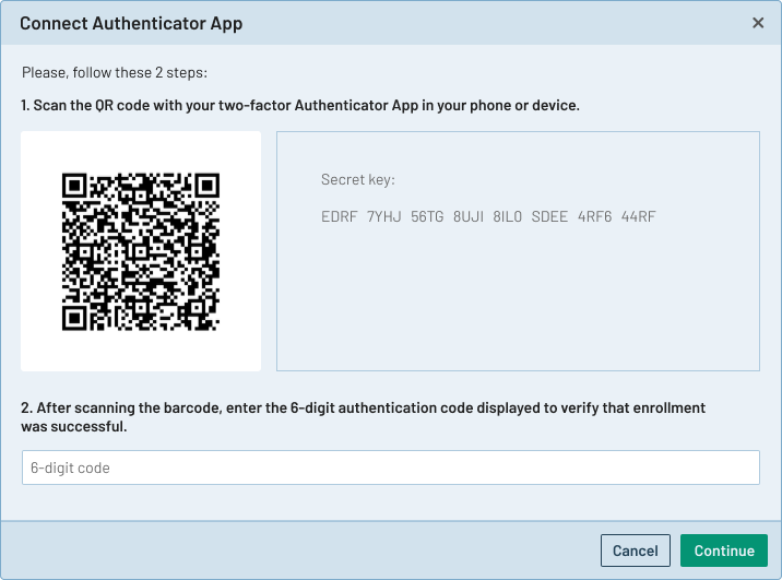 [接続] ボタンをクリックして QR コードとシークレット キーを取得して認証アプリに接続します。