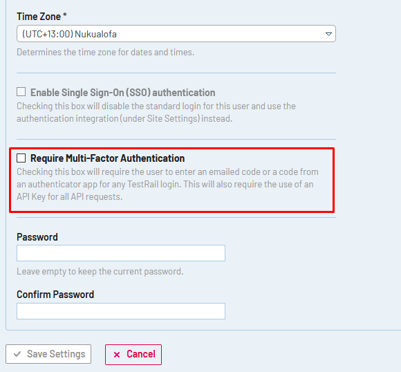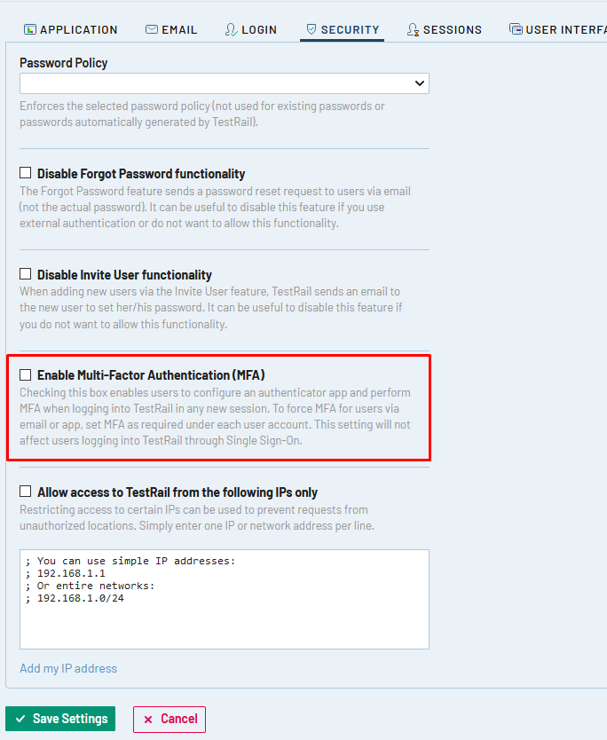 管理者はユーザーに多要素認証 (MFA) を使用して TestRail にログインするよう強制できます。 電子メールおよび Google Authenticator、Microsoft Authenticator、Duo mobile などの一般的な認証アプリを使用した認証を強制することで、盗まれた認証情報を使用して機密データにアクセスされる危険性に対する防御を高めることができます。