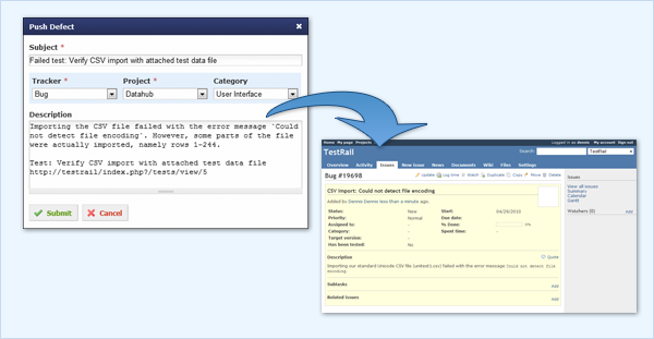 欠陥プラグインが設定されると、[結果の追加] ダイアログの [欠陥] フィールドの横に新しく [プッシュ] リンクが表示されるようになります。リンクをクリックするとポップアップ ダイアログが開き、TestRail を離れることなくバグ レポートを Redmine にプッシュできます。テスト結果が追加されている場合、課題 ID の上にマウス カーソルを合わせると、Redmine の課題に関する情報やステータスの詳細が表示されたウィンドウが開きます。