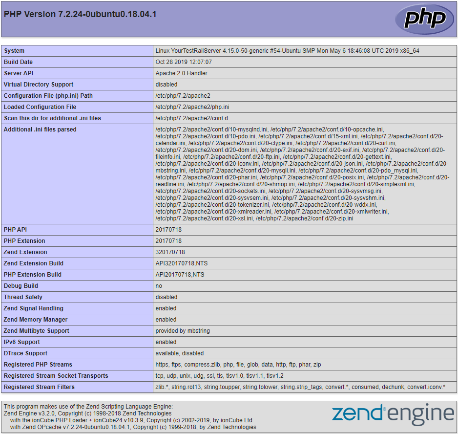 ファイルを保存した後、Web ブラウザーでファイルを参照して結果を確認します(つまり、http://<server>/phpinfo.php を開きます)。次のような出力が表示されるはずです。この情報は、TestRail のインストールの問題を調査するのにも役立ちます。