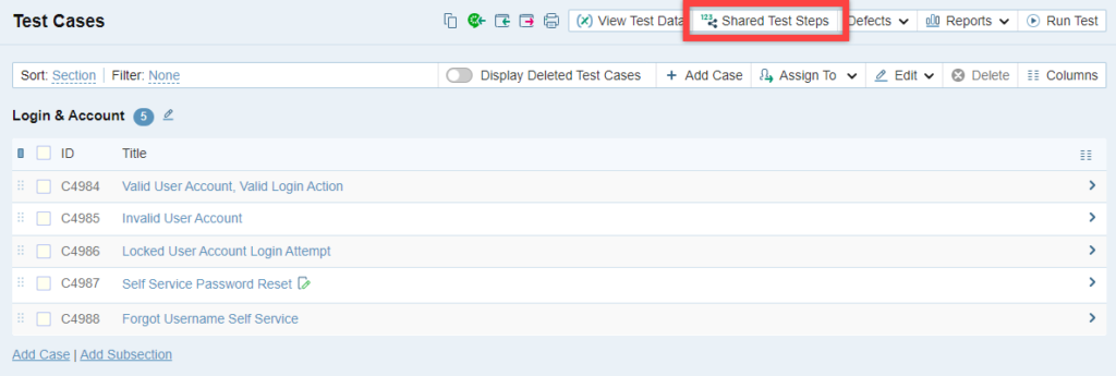 TestRail 7.0 以降では、テスト手順のセットを複数のテスト ケースで共有する機能が追加され、個々のテスト ケースで手順を編集する代わりに 1 つの手順セットを編集できるようになりました。