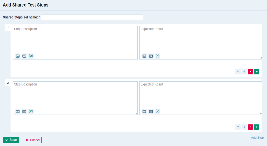 プロジェクトに個々の手順を使用するテスト ケース テンプレートが存在する場合、テスト ケース リリポジトリに [共有テスト手順] ボタンが表示されます。共有テスト手順のリストに追加されたテスト ステップは、現在のプロジェクトにあるすべてのテスト ケースの個々の手順フィールドで利用可能です。
