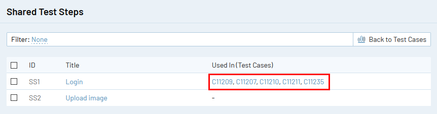 共有テスト手順のセットを追加すると、共有テスト手順リストから、どのテスト ケースで共有テスト手順が使用されているかを参照できます。このリストで共有テスト手順に加えた変更は、手順を使用しているすべてのテスト ケースに自動的に反映されます。