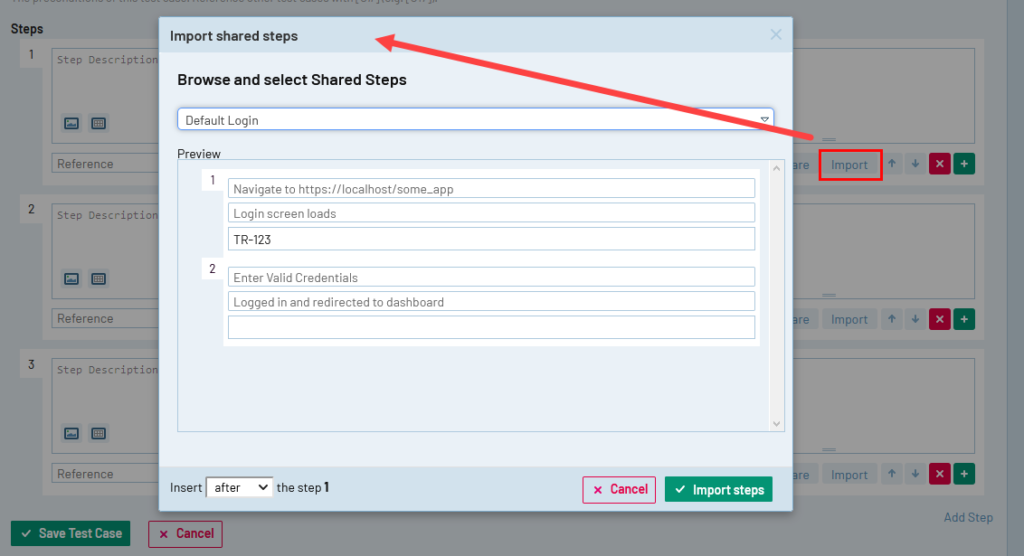 個別の手順フィールドを使用する新規または既存のテスト ケースで [手順の追加] をクリックし (まだ追加された手順がない場合)、[インポート] をクリックします。