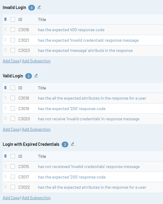 TestRail プロジェクトのテスト ケース ページに移動すると、テスト結果レポートに基づいて、TestRail によってテストケースが自動的に作成されていることがわかるでしょう。JUnit レポートのテストごとに classname および name 属性を組み合わせて一意の Automation ID が追加されています。