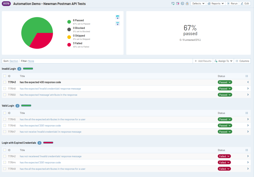 このチュートリアルでは、TestRail CLI を使用して、Postman の自動テスト実行 (Newman CLI を使用) で生成されたテスト結果を TestRail に統合する方法を説明します。統合によって、自動テストの結果を中央で管理し、TestRail が提供するすべての解析およびレポート機能を活用できます。