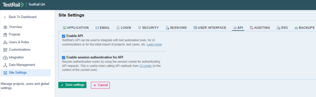 Ranorex と TestRail の間で通信を行うには、 TestRail API を使用する必要があります。TestRail にログインし、[管理] > [サイト設定] > [API] に移動します。API がまだ有効でなければ有効にします。