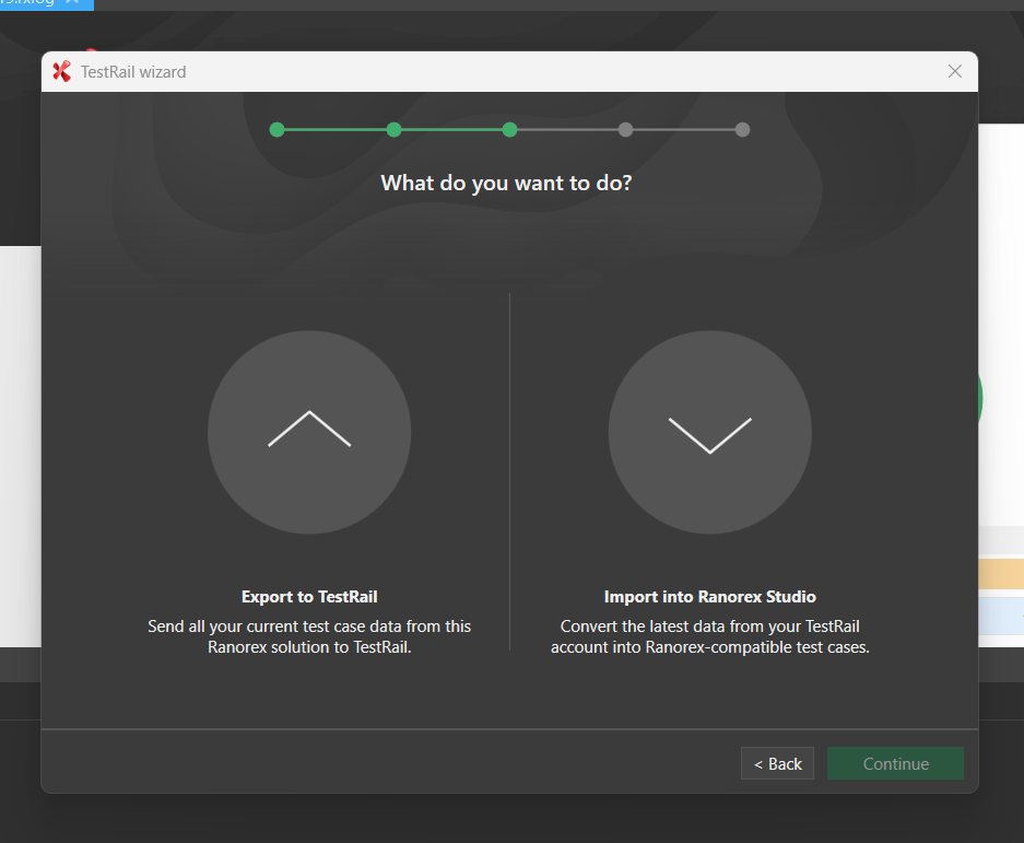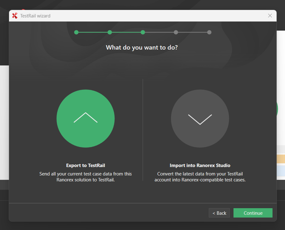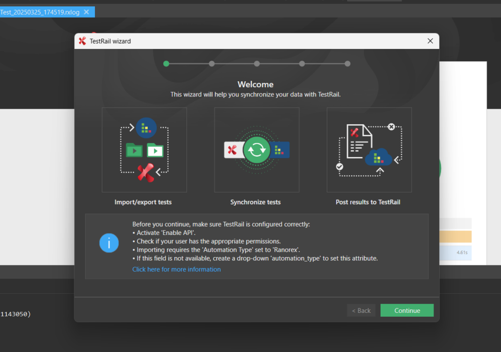 前のポップアップで [Continue] をクリックした後、新しく設定ステップを完了する必要があります。Ranorex と TestRail の統合は、次の 2つの方法のどちらかで設定できます。