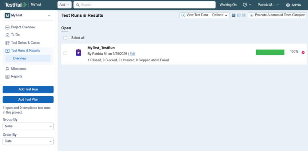 実行が完了したら、TestRail に戻り、テスト実行情報を確認します。