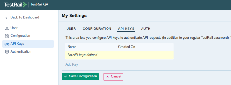TestRail インスタンスの URL、ユーザー名、API キー (ユーザー設定で確認できます) をメモします。