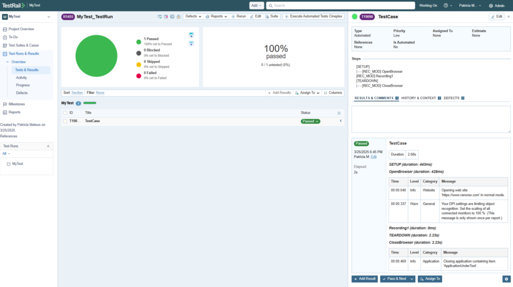 すべてが正常に完了すると、サイン アップが行われ、Ranorex と TestRail の統合が適切に設定されます。