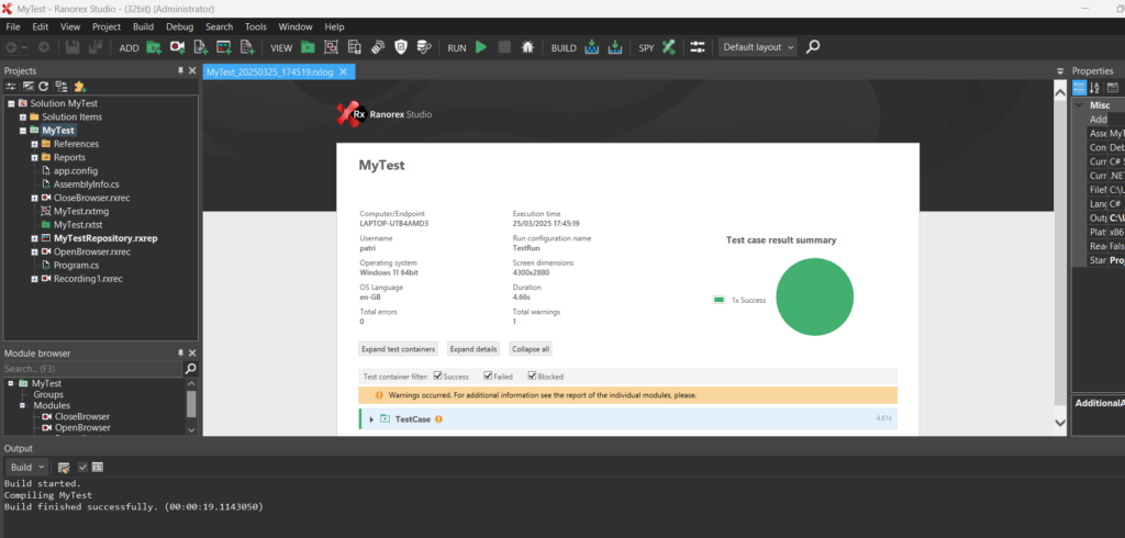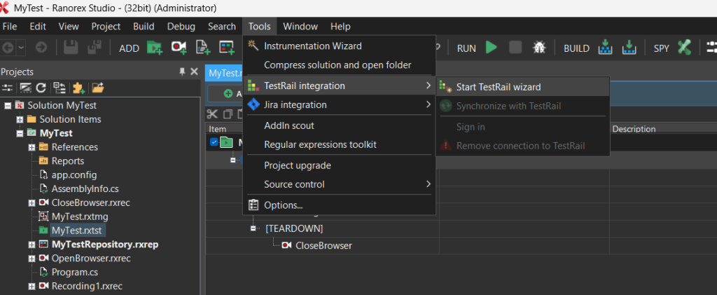 Ranorex テストが正しく設定されていることを確認します。Ranorex Studio を開き、テスト スイートをロードします。TestRail のテスト構造に合わせてテスト ケースを構成します。結果を追跡できるよう、Ranorex でテスト レポートが有効になっていることを確認してください。