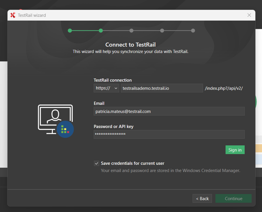 次のステップでは、TestRail 接続に関連するすべての情報を設定します。インスタンスの URL、ユーザーのメール アドレスおよびアクセス パスワード (または API キー) が必要です。