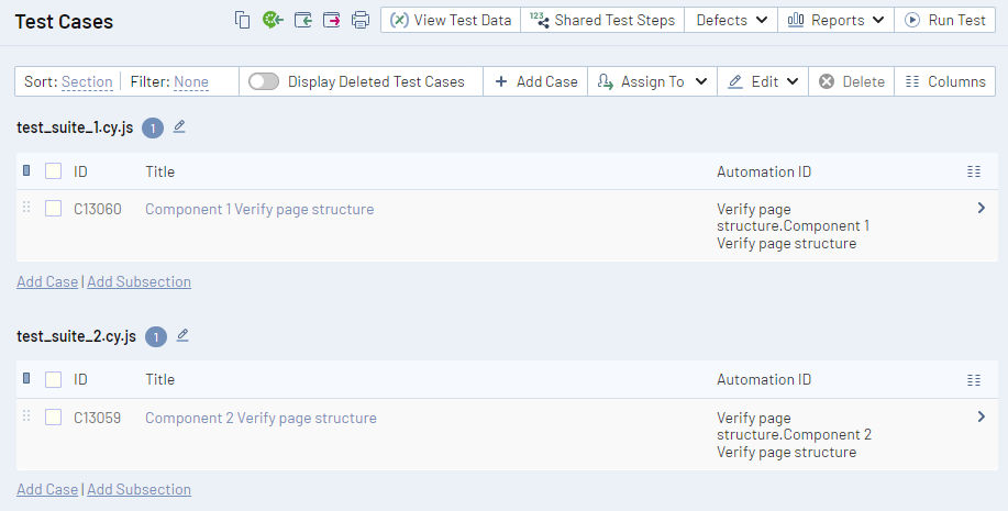 このレポートは、Firefox と Chrome の 2 つのデバイスでの 1 つのプロジェクトの実行を含んでおり、次の画像のとおり、testsuite 要素名で識別できます。つまり、TestRail CLI は TestRail に 2 つのテスト ランを作成し、それぞれのテスト結果を追加します。各テスト ランには、Component 2 Verify page structure および Component 1 Verify page structure という同じテストが含まれています。