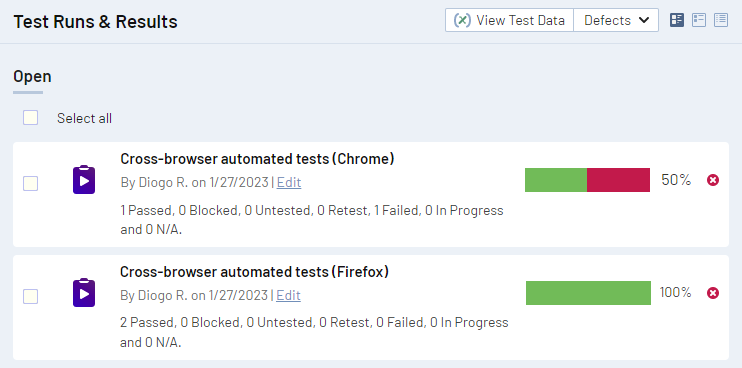 • ブラウザー + プラットフォームの組み合わせ個別の TestRail テスト ランになります (たとえば、「Chrome 106 – Windows 11」および「Firefox 108 – Windows 11」)。