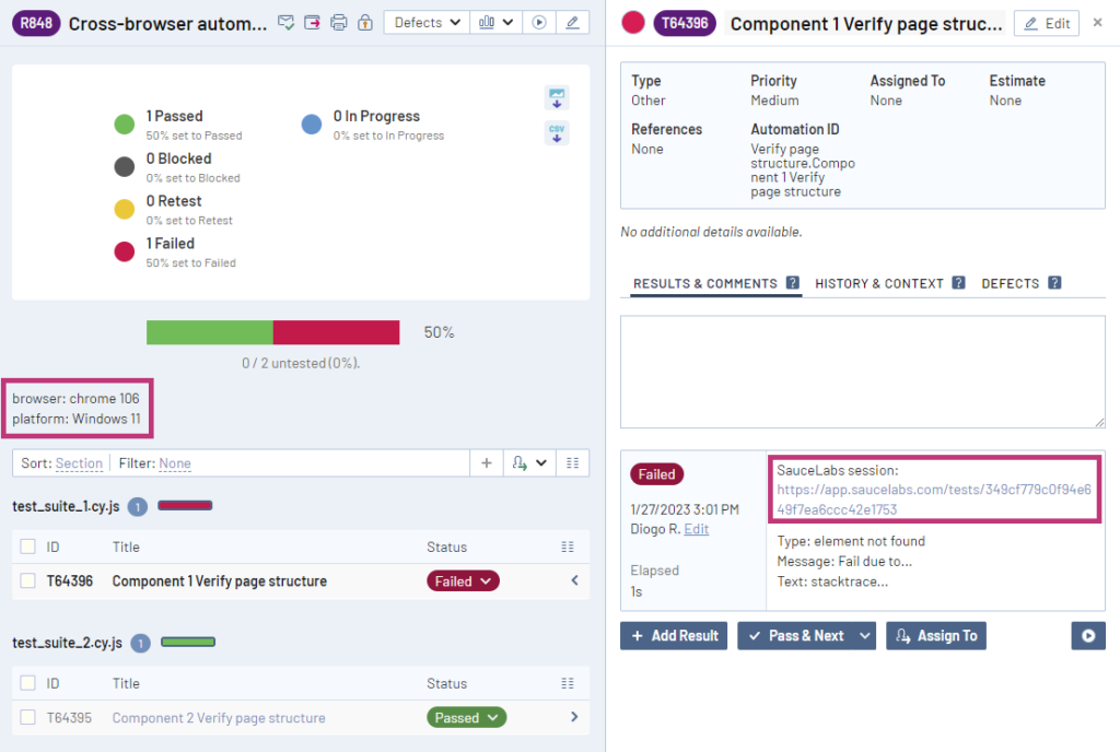また、TestRail は、各テスト ランの説明に browser および platform の値を追加し、セッションの url を各テスト ケースの結果に追加します。