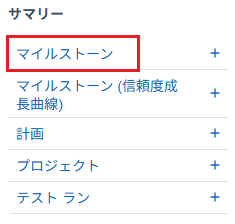 | マイルストーン | マイルストーンのサマリーを表示します。 今週、今月、などの単位で特定のマイルストーンの進捗、テスト結果を確認したい場合にご利用ください。 |