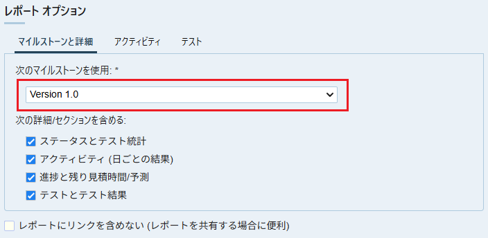 - [レポートオプション] の「マイルストーンと詳細」タブの「次のマイルストーンを使用」で Version 1.0 を選択します。