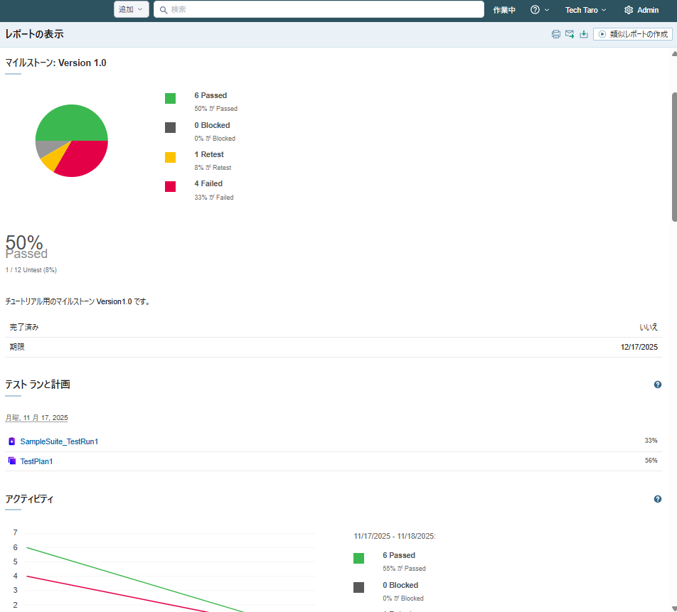 | アクティビティのサマリー | 新規追加されたテストケースおよび更新されたテストケースの一覧を表示します。 作成、更新を行ったテストケースを確認する場合にご利用ください。 |