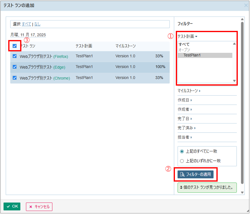 - フィルター > テスト計画 > TestPlan を選択して「フィルターの適用ボタン」を押下