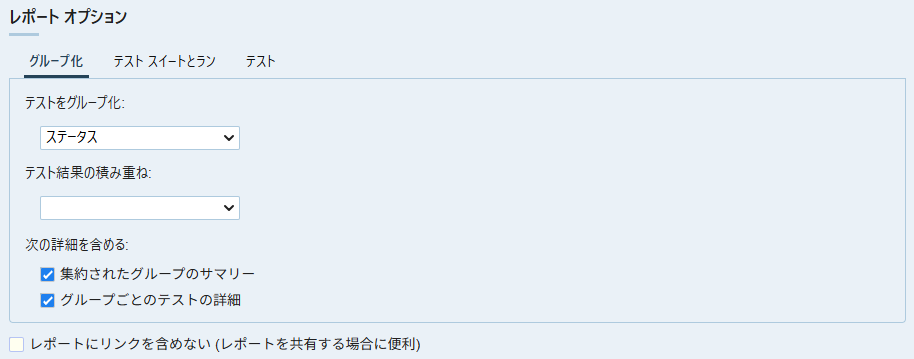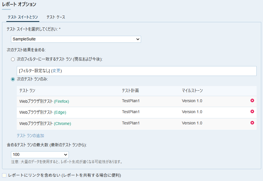 - [レポートオプション] の「テストスイートとテストラン」タブで次の設定を行います。