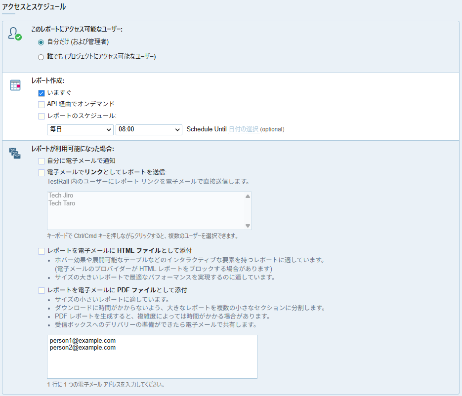 TestRail ではレポート機能が搭載されており、レポートの生成、スケジューリング、共有、および電子メール送信ができます。