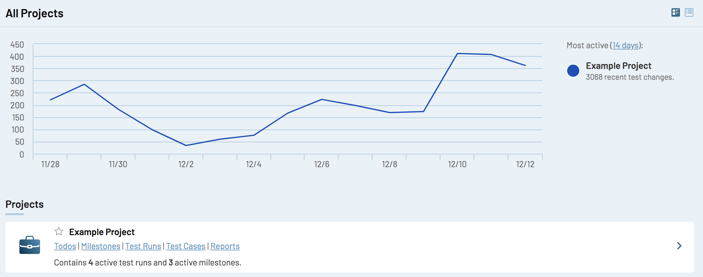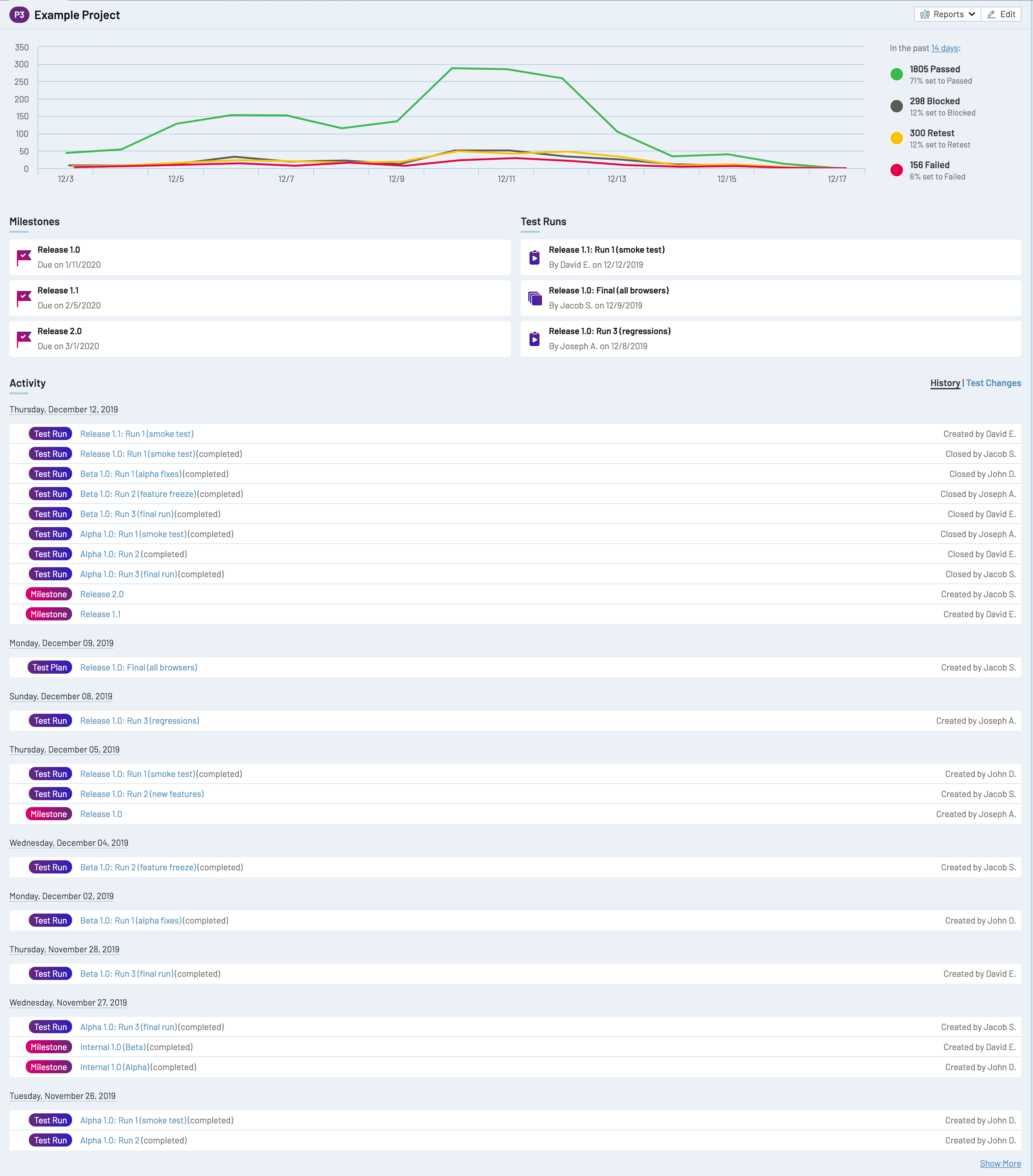 プロジェクト ダッシュボードには、特定のプロジェクトに関するスナップショットと、関連するテスト ラン、マイルストーン、最近のレポート、プロジェクトの活動などの関連情報が表示されます。アドレスの例: