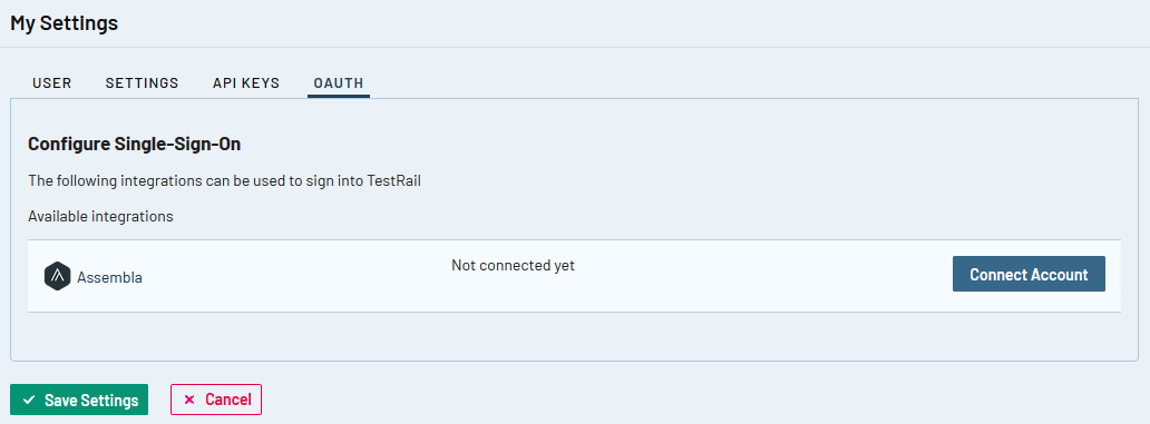 With TestRail connected to Assembla, you can connect your TestRail account to Assembla using OAuth. In the My Settings area of your user account, open the OAuth tab: