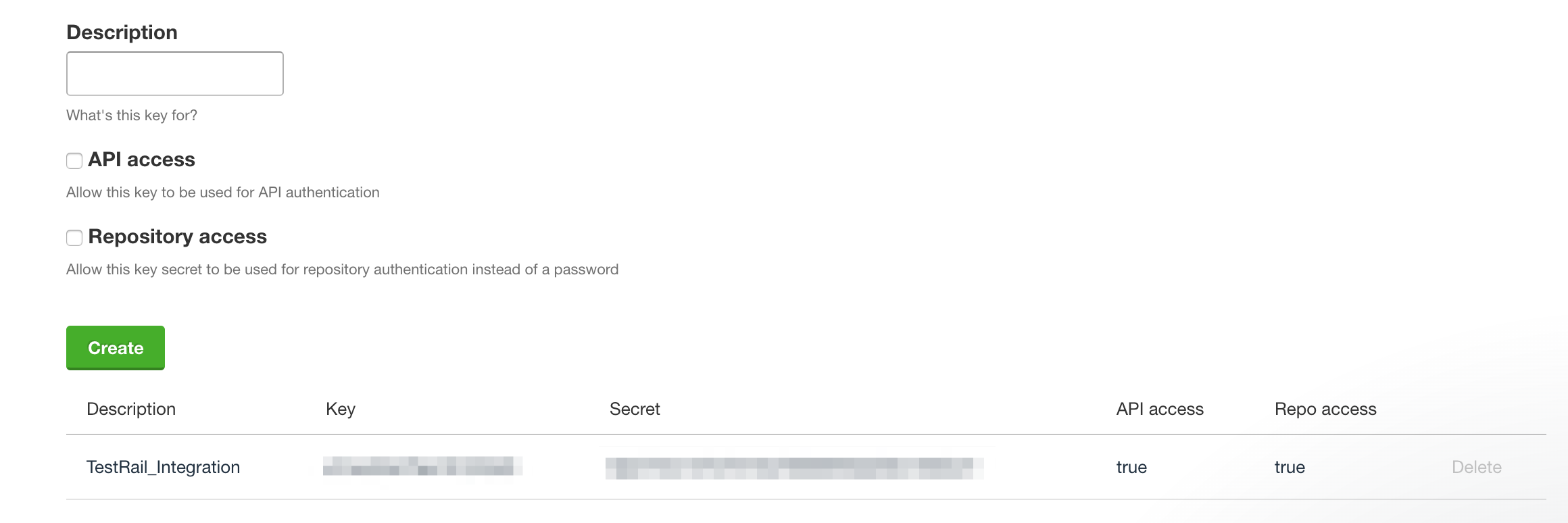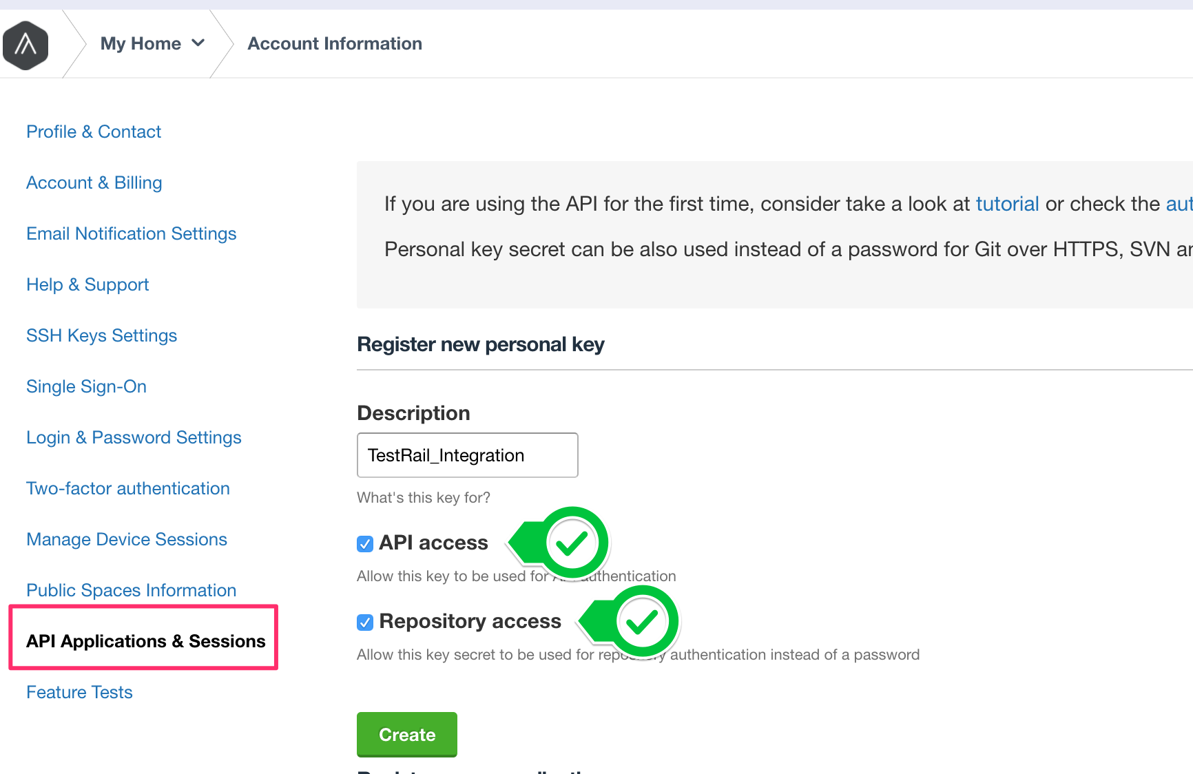 With TestRail connected to Assembla using an API Key and Secret, you will need to create an API key and secret in your Assembla account. You can do this under Account > API Applications & Session. Please ensure to check the boxes for API access and Repository access.