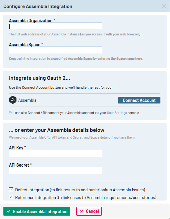 With your Assembla Organization URL and Space entered in the dialog, you can press the Connect Account button and TestRail will complete the configuration for you. Alternatively, you can enter the API Key and API Secret.