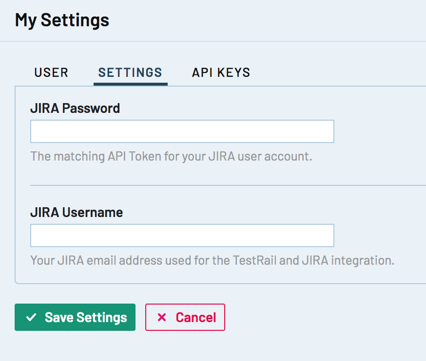 またウィザードは、各ユーザーが固有の Jira 統合設定を入力できるよう、ユーザー変数との統合も自動的に設定します (ユーザー固有の設定がない場合は、入力された代替ユーザーが使用されます)。Jira ユーザーを設定するには、各ユーザーは TestRail インターフェイズの右上隅にある自分の名前をクリックして、各自の [個人設定] ページに詳細を入力するだけです。
