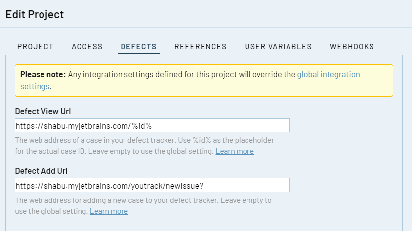 The defect URLs are used to let TestRail know how to convert a Defect ID into a URL for your YouTrack instance. There are two types of URLs: View URLs and Add URLs.