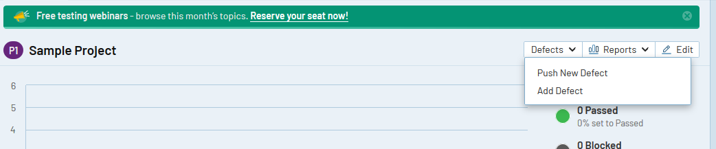 [欠陥] メニューの [欠陥の追加] オプションを使用すると、外部ツールの欠陥作成画面が開きます。この機能を利用するには、TestRail または現在のプロジェクトに欠陥追加 URL を設定する必要があります。