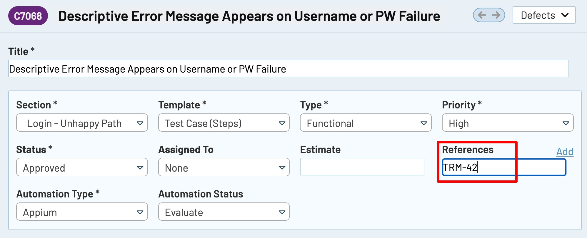 設定が完了した後は、テスト ケース、ラン、計画、マイルストーンの欠陥フィールドに課題 ID をコピー&ペーストすれば、TestRail が自動的にハイパーリンクを生成します。カンマ区切りのリストとして追加することで、1 つのエンティティに複数の参照をリンクすることができます。